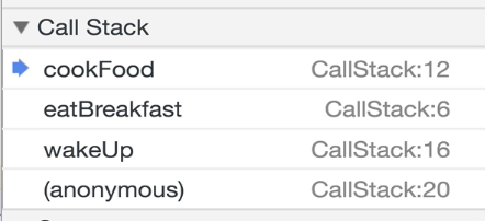 Call Stack은 사진과 같이 wakeUp -> eatBreakfast -> cookFood 순으로 쌓이며,