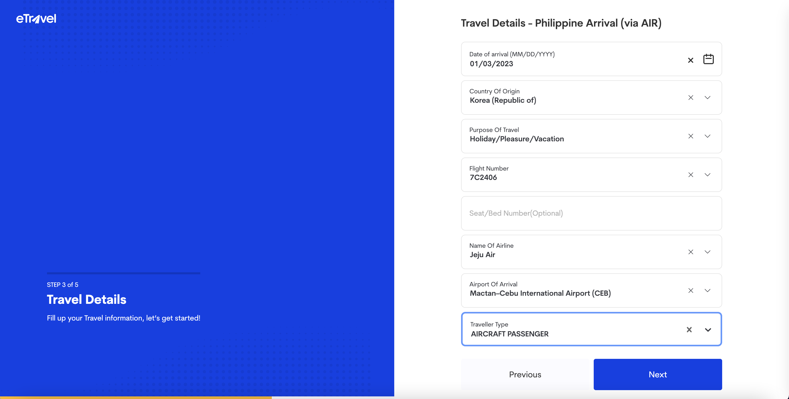 Date of arrival (MM/DD/YYYY) : 필리핀 도착 날짜 (01/03/2023 -> 2023년 01월 03일)