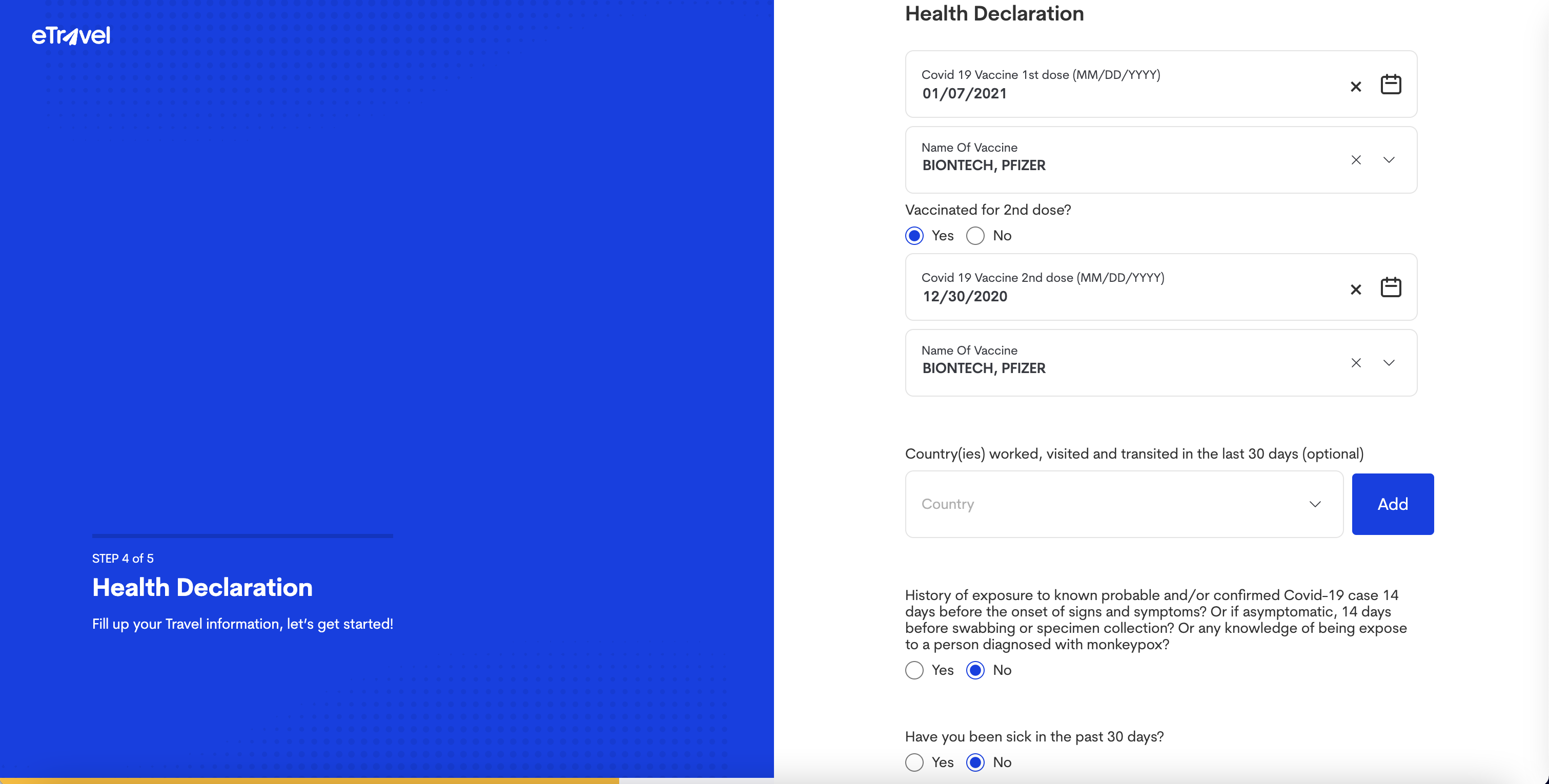 Country(ies) worked, visited and transited in the last 30 days (optional)