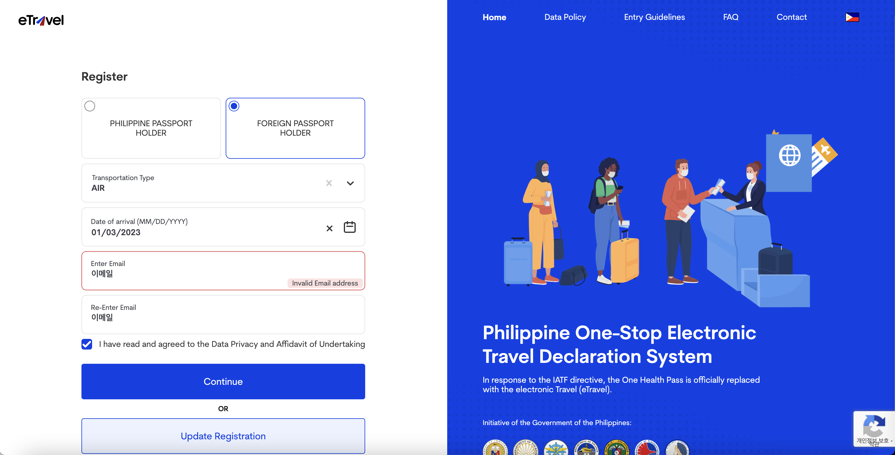 우선 링크는 https://etravel.gov.ph/ 입니다. (2023/01/03 기준 작성이라 추후 달라질 수 도 있습니다.)