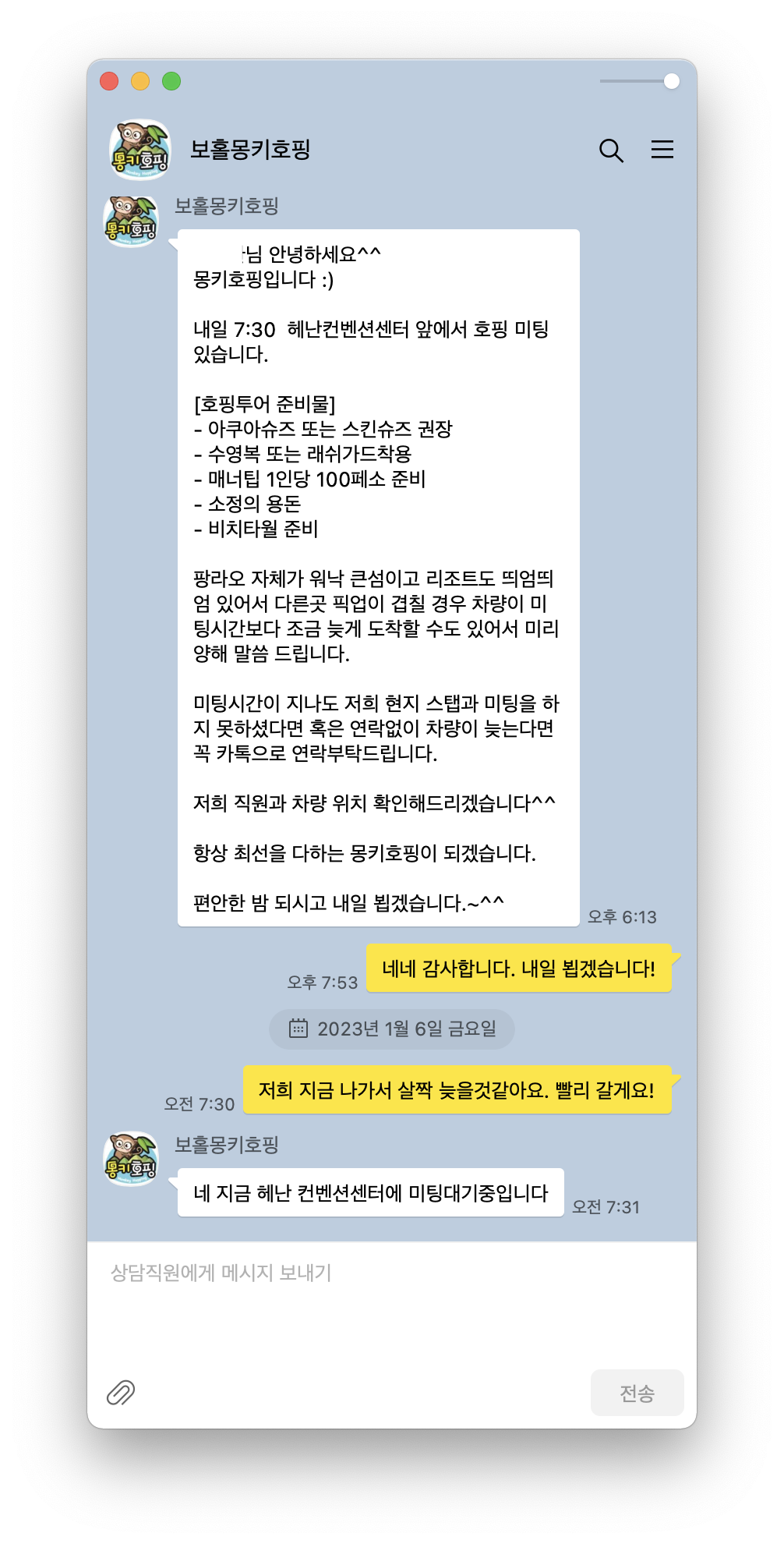 몽키호핑투어 링크는 https://cafe.naver.com/rora002 이에요. 호핑하는 사진들 궁금하시면 카페에서 이것저것 눌러 보시면 될 것 같아요.
