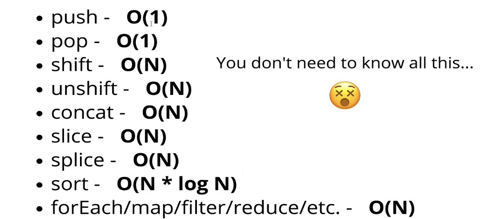 Objects const instructor = { firstName = "Kelly", isInstructor = true, favoriteNumbers = [1,2,3,4]; } Objects 의 Big O Insertion(삽입) - O(1) Removal(삭제) - O(1) Searching(탐색) - O(n) Access(접근) - O(1) 객체는 정렬되어 있을 필요가 없을때 잘 작동하며, 빠른 접근, 입력과 제거를 원할 때 좋다. 여기서 말하는 탐색은 key를 말하는 것이 아니라, 어떤 특정한 정보가 어떤 값에 있는지 확인하는 것을 뜻한다. (firstName을 찾는 것이 아니라는 뜻이다.) 이때 모든 아이템에 모든 속성을 확인해야 한다.(풀스캔) Object Methods 의 Big O Ob..