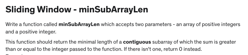 minSubArrayLen([2,3,1,2,4,3], 7) // 2 -> because [4,31 is the smallest subarray