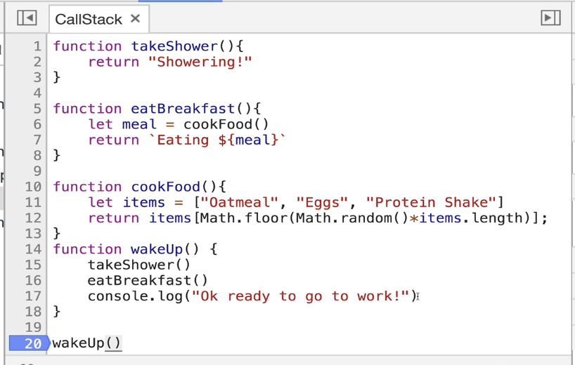 제일 위에 있는 cookFood부터 제일 아래에 있는 wakeUp 순으로 위에서 아래로 함수가 처리된다.
